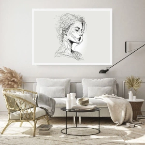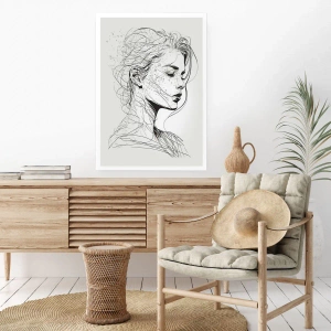 Poster - Uno schizzo di una donna con i capelli fluenti, realizzato in stile minimalista. - 50x70cm - Ritratto pensieroso - Decorazione murale moderna per soggiorno e camera da letto ARTTOR