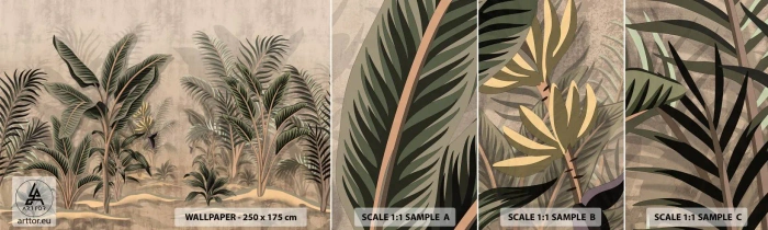 Campione Di Fotomurale Standard Eco - Incisione in stile coloniale - Foresta tropicale, Palma da cocco, Albero di banane - 100x30 cm