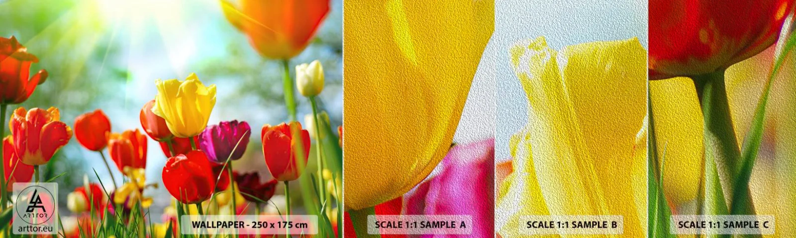 Campione di Fotomurale Premium Sand - Tutti i colori del sole - Tulipani, Fiori, Prato - 100x30 cm