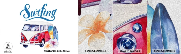 Campione di Fotomurale Premium Sand - In pulmino a fare surf - Autobus d'epoca, Viaggi, Tavola da surf - 100x30 cm