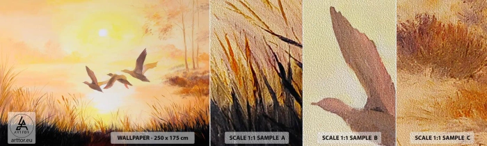 Campione di Fotomurale Premium Sand - L'inizio di un lungo viaggio - Natura, Anatra selvatica, Paesaggio - 100x30 cm