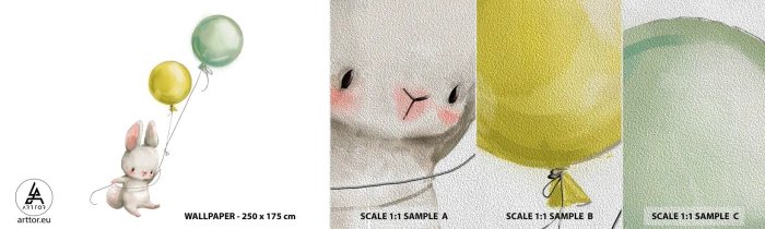 Campione di Fotomurale Premium Sand - Volo anch'io! - Per bambini, Coniglio, Palloncini colorati - 100x30 cm