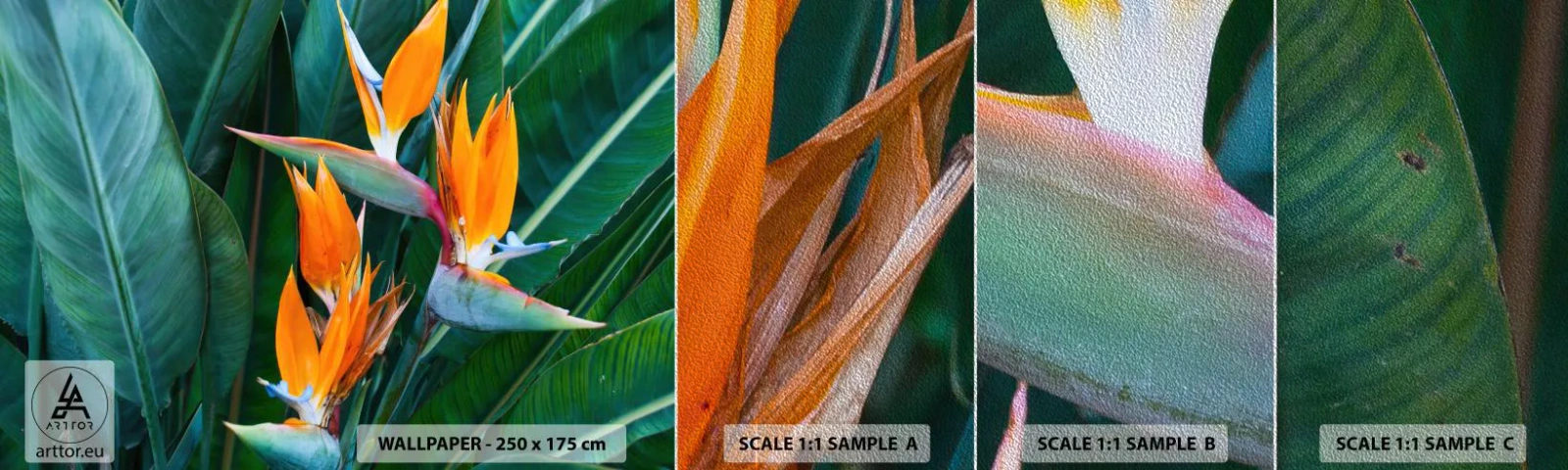 Campione di Fotomurale Premium Sand - È un fiore o un uccello? - Strelitzia Reale, Fiore, Africa - 100x30 cm