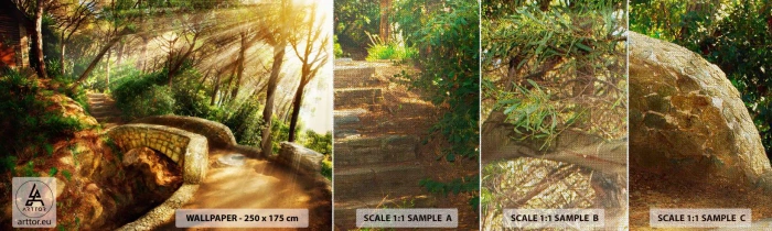 Campione di Fotomurale Premium Canvas - Dal ponte direttamente nel bosco delle fiabe - Paesaggi, Scale di pietra, Raggi del sole - 100x30 cm