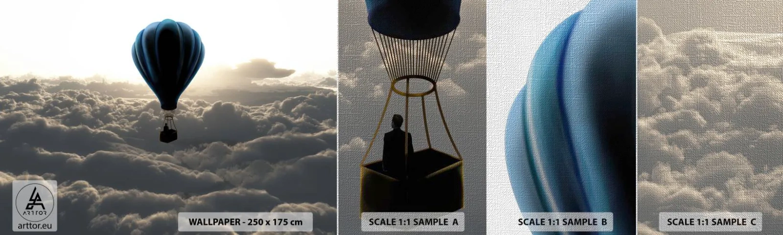 Campione di Fotomurale Premium Canvas - Viaggiatore sopra le nuvole - Paesaggio, Volo in mongolfiera, Viaggi - 100x30 cm