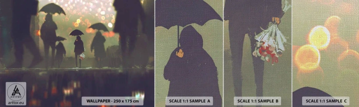 Campione di Fotomurale Premium Canvas - Dalla prospettiva di una goccia di pioggia - Camminare sotto la pioggia, Persone, Grafica - 100x30 cm