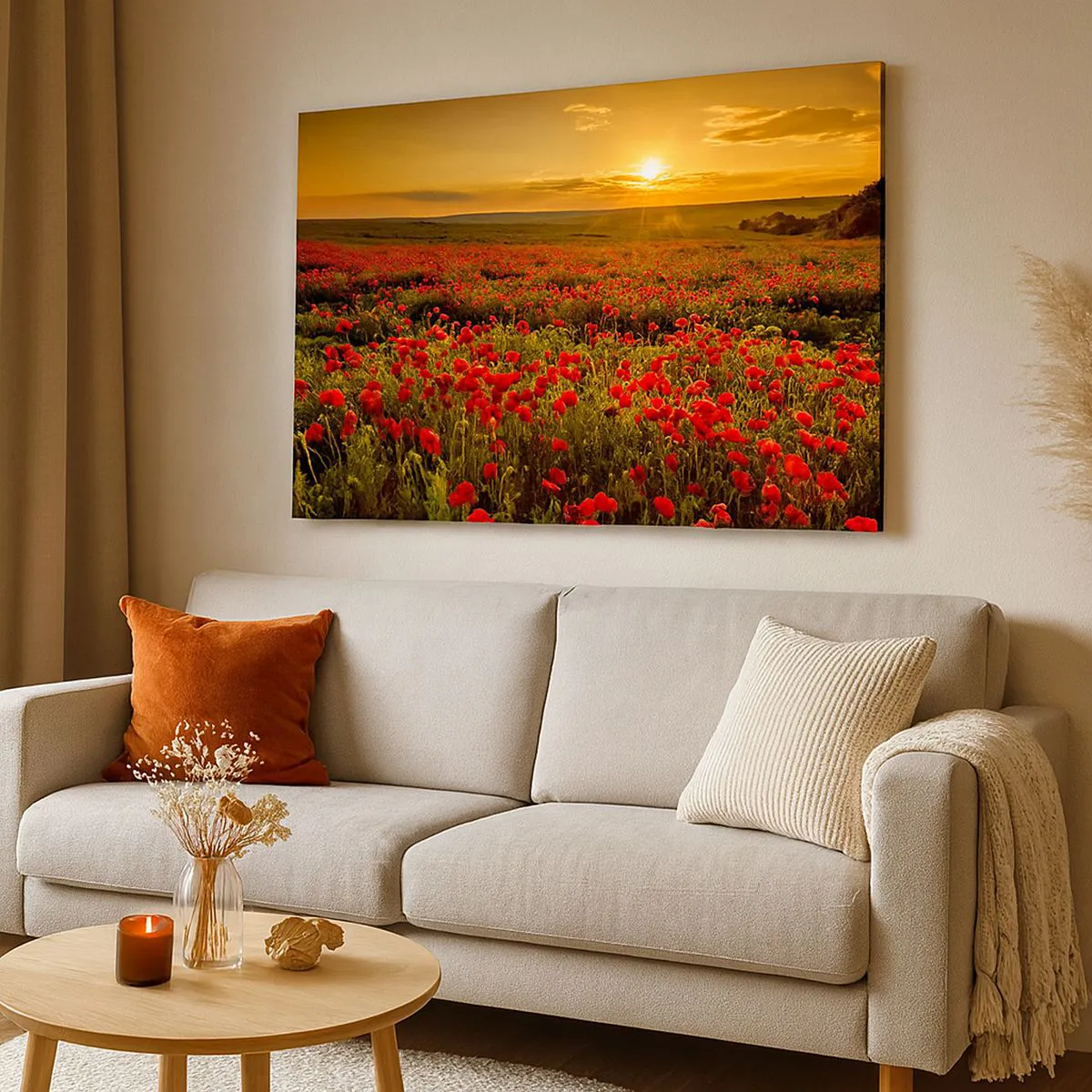 - Un incantevole dipinto raffigurante un vasto campo di papaveri immerso nei raggi dorati del sole al tramonto. Una scelta perfetta per portare la bellezza e la tranquillità della natura nei vostri interni.
