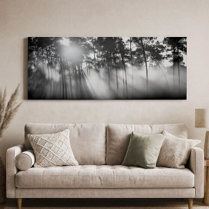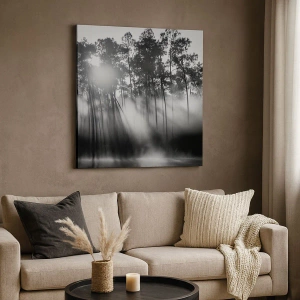 "Unstoppable Sun" è un dipinto unico su tela di 70x50 cm in formato orizzontale, che raffigura una fotografia in bianco e nero di una foresta nella nebbia mattutina. La delicatezza delle sfumature e il gioco di luci conferiscono al dipinto un'atmosfera unica che cattura lo sguardo e introduce un'atmosfera di pace e armonia negli interni.