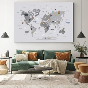 Quadro su tela - Stampe su Tela - Una mappa del mondo con illustrazioni di animali su uno sfondo grigio - 70x50cm - Dimmi di dove sei... - Decorazione murale moderna per soggiorno e camera da letto ARTTOR