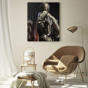 Quadro su vetro - Un soldato con una bandiera americana su uno sfondo scuro - 70x50cm - Proprio per questo - Decorazione murale moderna per soggiorno e camera da letto ARTTOR