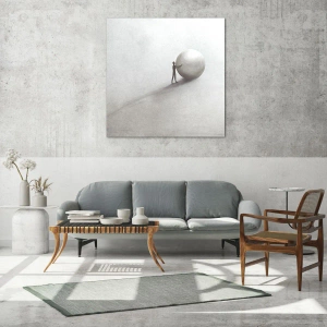 Quadro su vetro - Una silhouette minimalista di un uomo con una grande palla su uno sfondo chiaro. - 120x80cm - Il gioco della vita - Decorazione murale moderna per soggiorno e camera da letto ARTTOR