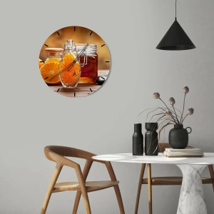 Orologio da parete - Orologio in Vetro - Una bottiglia di liquido ambrato e arance fresche - 30x30cm - Il gusto e l'aroma del sole - Decorazione murale moderna per soggiorno e camera da letto ARTTOR