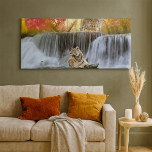 Quadro su tela - Stampe su Tela - Tigri presso una cascata nella foresta autunnale - 50x70cm - Paesaggio surreale - Decorazione murale moderna per soggiorno e camera da letto ARTTOR