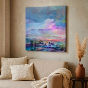 - Un paesaggio montano artistico con cieli color pastello e un piccolo villaggio incastonato nella valle. Questo dipinto è pieno di armonia e tranquillità, perfetto per arredare interni ispirati alla natura.