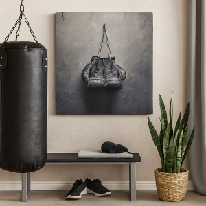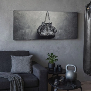 Quadro su tela "Vecchi guantoni da boxe su sfondo a muro" è una decorazione unica che unisce austerità ed eleganza. Il motivo centrale sono i guantoni da boxe con evidenti segni di usura, appesi su una parete testurizzata in toni monocromatici. Questa composizione enfatizza il contrasto tra la morbidezza del materiale e la durezza dello sfondo, creando armonia ed espressività.