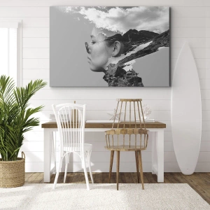 Quadro su tela - Stampe su Tela - Una composizione in bianco e nero con la silhouette di una donna e un paesaggio montano. - 70x50cm - Ritratto montano nuvoloso - Decorazione murale moderna per soggiorno e camera da letto ARTTOR