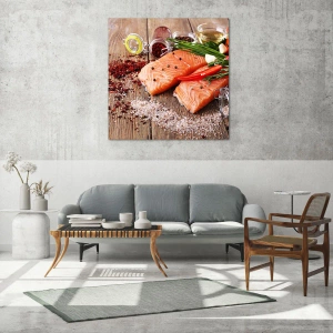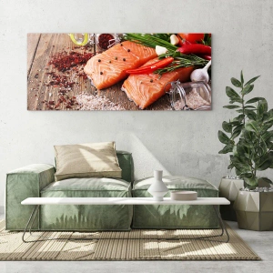 Quadro su vetro - Filetti di salmone con spezie su un piano di lavoro in legno - 70x50cm - Avventura norvegese in cucina - Decorazione murale moderna per soggiorno e camera da letto ARTTOR