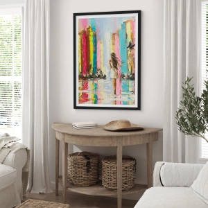 - Questo poster raffigura una donna che cammina tra edifici colorati in stile impressionista. I suoi colori vivaci e l'espressione artistica lo rendono la decorazione perfetta per interni moderni.