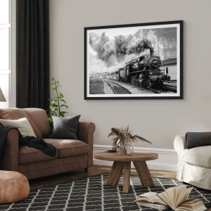 - Il poster "Stoi na station..." raffigura una locomotiva a vapore in un paesaggio montano, con il vapore che sale. Questo design in bianco e nero è perfetto per interni eleganti e classici. Il prodotto è dotato di cornice nera.