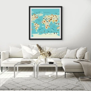 Poster in cornice nera - Una mappa del mondo con illustrazioni di animali in diverse regioni - 50x70cm - Buoni vicini - Decorazione murale moderna per soggiorno e camera da letto ARTTOR