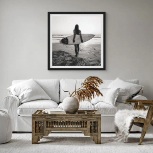 L'immagine di una donna con una tavola da surf simboleggia passione, libertà e forza, rendendo questo poster non solo un'aggiunta estetica, ma anche una fonte di ispirazione. Dettagli come i riflessi di luce sull'acqua e la consistenza della sabbia sono stati catturati in modo armonioso e discreto, rendendo l'effetto complessivo deliziosamente profondo.