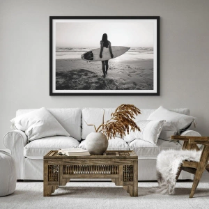 - Questo poster raffigura una donna con una tavola da surf su una spiaggia al tramonto. Il design in bianco e nero è perfetto per interni eleganti e moderni. Il set include una cornice nera di 50x70 cm.