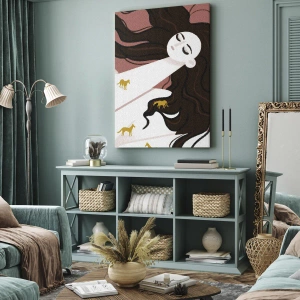 "Sogno di un cavallo dorato" è un dipinto ricco di sensibilità ed espressività. Raffigura una figura con gli occhi chiusi, la cui espressione calma del viso sembra simboleggiare armonia e pace interiore. Delicati capelli castani si stendono tutt'intorno, creando una composizione sottile e artistica. Sulla sua superficie sono visibili le sagome di cavalli dorati, che aggiungono profondità e carattere magico all'immagine.