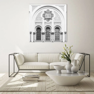 Quadro su vetro - La facciata di un edificio storico con finestre decorative e dettagli - 50x70cm - Al confine delle culture - Decorazione murale moderna per soggiorno e camera da letto ARTTOR