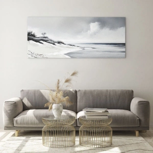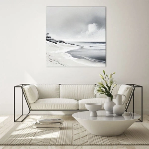 • Il dipinto raffigura un tranquillo paesaggio marino in bianco e nero. La forma minimalista e i colori tenui creano un'atmosfera suggestiva e un senso di tranquillità.
