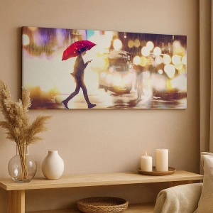 Quadro su tela - Stampe su Tela - Una figura con un ombrello rosso sulla strada sotto la pioggia - 70x50cm - Tuttavia è assolata - Decorazione murale moderna per soggiorno e camera da letto ARTTOR