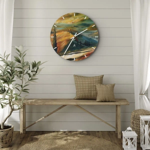 - Un orologio con un paesaggio ispirato al paesaggio toscano, punteggiato di colline e cipressi. La composizione artistica, dai toni caldi, cattura l'atmosfera della campagna italiana e aggiunge un tocco idilliaco a qualsiasi interno.