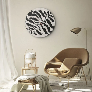Il design è caratterizzato da uno stile grafico con influenze minimaliste e organiche. Il contrasto tra nero e beige crea chiarezza, mentre le forme delicate creano un insieme calmo ed estetico. Questo orologio si adatta alle tendenze decorative contemporanee, dallo stile scandinavo a quello giapponese, fino al moderno boho.