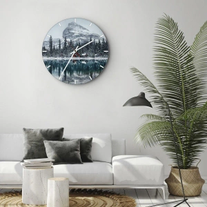 - Questo orologio da parete in vetro da 30x30 cm raffigura un paesaggio invernale con montagne innevate, una foresta, un lago e un riflesso del paesaggio. Il conforto della natura in una forma artistica e decorativa.