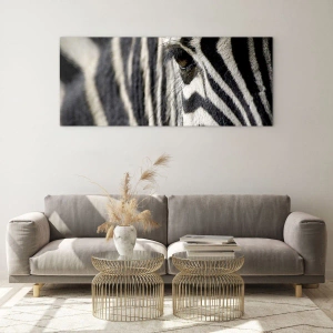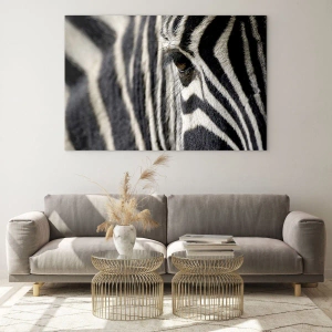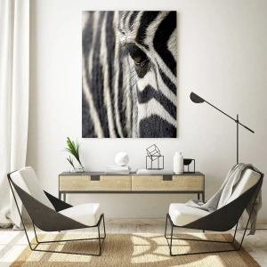 Il dipinto "Ritratto a strisce" raffigura un primo piano dell'occhio di una zebra e delle sue caratteristiche strisce bianche e nere. Questa prospettiva unica permette di ammirare i sottili dettagli che rendono la zebra uno degli animali più affascinanti al mondo. Il contrasto tra le strisce bianche e nere crea una composizione distintiva che cattura lo sguardo e conferisce agli interni un carattere moderno.