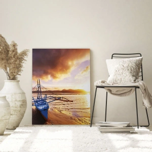 - Un dipinto pittoresco di una barca su una spiaggia al tramonto. Il cielo drammatico e i colori caldi creano un'atmosfera romantica ed esotica, perfetta per la decorazione d'interni.