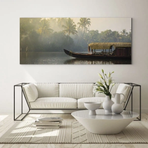 Quadro su vetro - Una barca su un fiume calmo circondata da palme al mattino - 50x70cm - Casa sul fiume - Decorazione murale moderna per soggiorno e camera da letto ARTTOR
