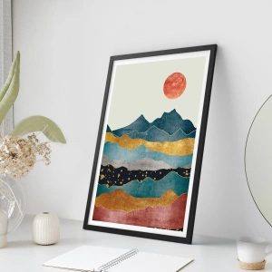 - Il poster raffigura montagne astratte nei toni dell'oro, del blu e del rosso, creando una composizione armoniosa. I colori caldi e le forme geometriche gli conferiscono un aspetto elegante.