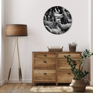 "Essere Umani" è una composizione grafica in movimento, posizionata su un orologio da parete rotondo di 30x30 cm, realizzato su vetro da ARTTOR. Il dipinto raffigura le mani intrecciate di persone di diverse generazioni ed etnie, catturate in bianco e nero. Ogni gesto ha un significato: dal tocco, al sostegno, fino al gesto di comprensione. Questo motivo artistico evoca associazioni con empatia, solidarietà e calore umano.
