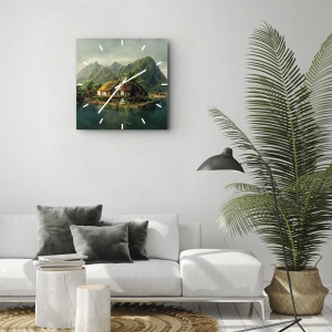 Orologio da parete - Orologio in Vetro - Capanne di palme sull'acqua circondate da montagne tropicali - 30x30cm - Paradiso tropicale - Decorazione murale moderna per soggiorno, cucina e camera da letto ARTTOR