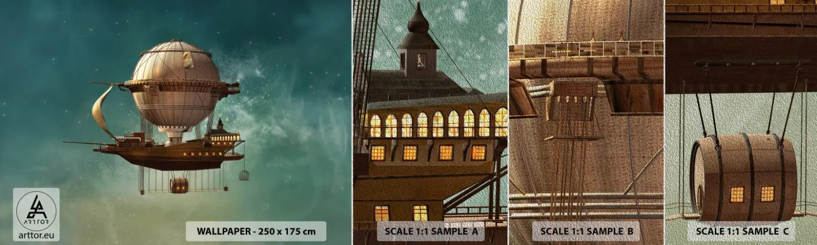 Campione di Fotomurale Premium Sand - Saluti da Jules Verne - retrò, Viaggio, Palloncino - 100x30 cm