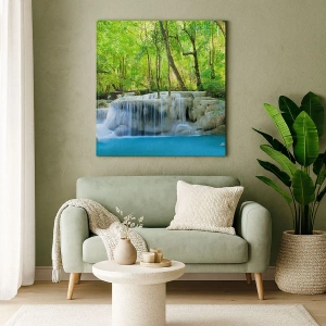 Quadro su tela - Stampe su Tela - Una cascata tra alberi verdi con acqua blu in un ambiente naturale - 70x50cm - Annegare nel turchese e nel verde - Decorazione murale moderna per soggiorno e camera da letto ARTTOR