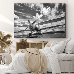 • Questo dipinto raffigura un vecchio aereo fotografato in un aeroporto in bianco e nero, creando un'atmosfera retrò e nostalgica. Perfetto per interni in stile industriale.