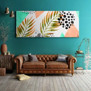 La stampa su tela "Decorazione con foglie di palma" è una decorazione unica che combina un motivo tropicale con moderne forme geometriche. La composizione è composta da foglie verdi, triangoli pastello e motivi delicati, creando un effetto visivo armonioso e dinamico. È una scelta eccellente per chi apprezza la creatività e le decorazioni non convenzionali.