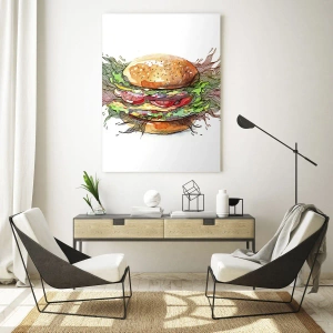 Quadro su vetro - Disegno artistico di un hamburger con dettagli acquerellati - 50x70cm - Una tentazione calda - Decorazione murale moderna per soggiorno e camera da letto ARTTOR