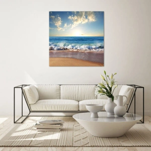 Quadro su vetro - Onde dell'oceano che si infrangono su una spiaggia dorata all'alba - 70x50cm - Insieme movimento e immobilità - Decorazione murale moderna per soggiorno e camera da letto ARTTOR