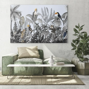 Quadro su vetro - Giungla tropicale con animali esotici su sfondo grigio - 70x100cm - Favola africana - Decorazione murale moderna per soggiorno e camera da letto ARTTOR