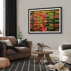Poster in cornice nera - Una donna in kimono con un ombrello sullo sfondo di un paesaggio autunnale. - 70x50cm - Nel tempio della natura - Decorazione murale moderna per soggiorno e camera da letto ARTTOR