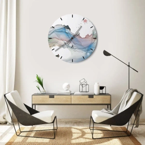 - Un orologio da parete con un motivo artistico di montagne dai colori pastello e una barca che galleggia sulla superficie dell'acqua. La composizione trasmette armonia, pace e ispira tranquillità. Perfetto per interni moderni.