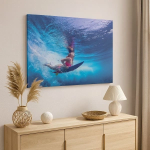 Quadro su tela - Stampe su Tela - Un surfista sott'acqua in una composizione dinamica nei toni del blu. - 50x70cm - La profondità della gioia - Decorazione murale moderna per soggiorno e camera da letto ARTTOR
