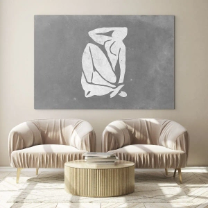 Il quadro in vetro "In Thought" è una proposta unica per gli amanti del minimalismo moderno e dell'arte che esprime emozioni attraverso la forma. Raffigura una silhouette femminile seduta, realizzata con semplici linee bianche su uno sfondo grigio scuro. L'intera opera è sagomata, conferendo all'immagine una sottile eleganza e una straordinaria profondità.